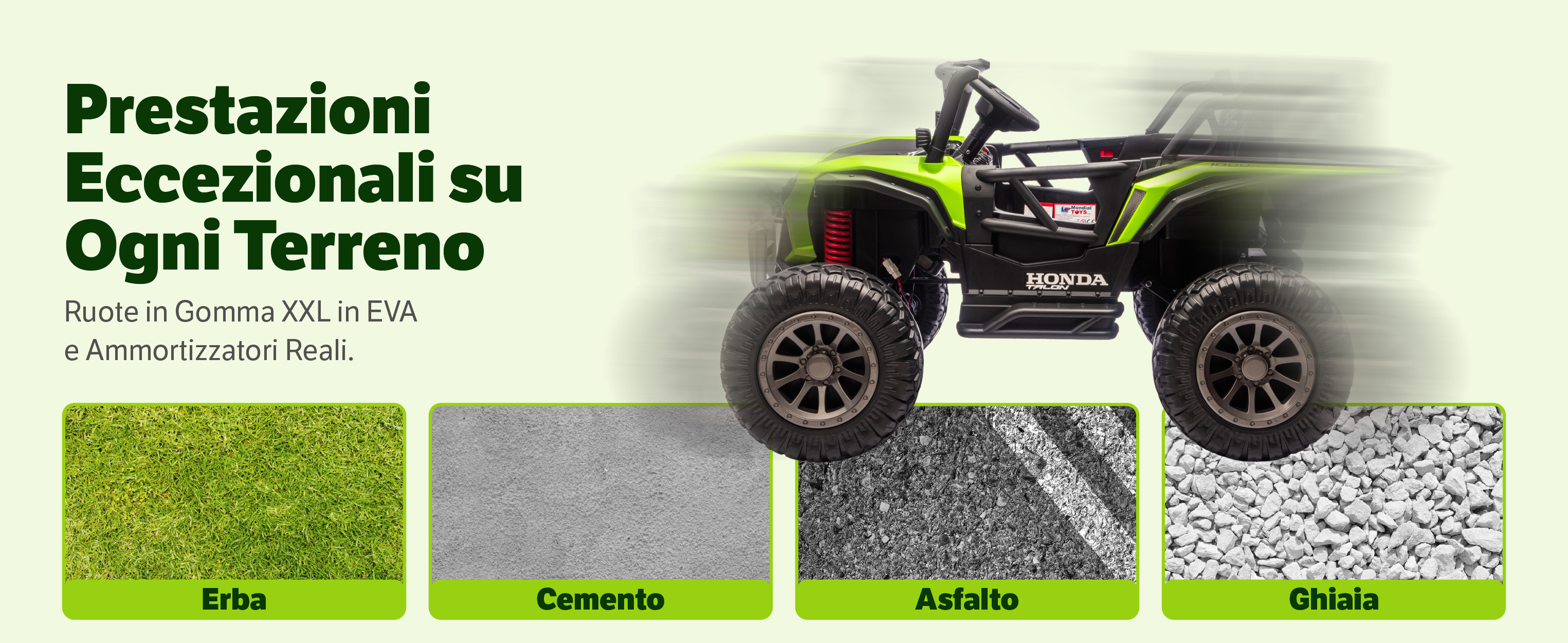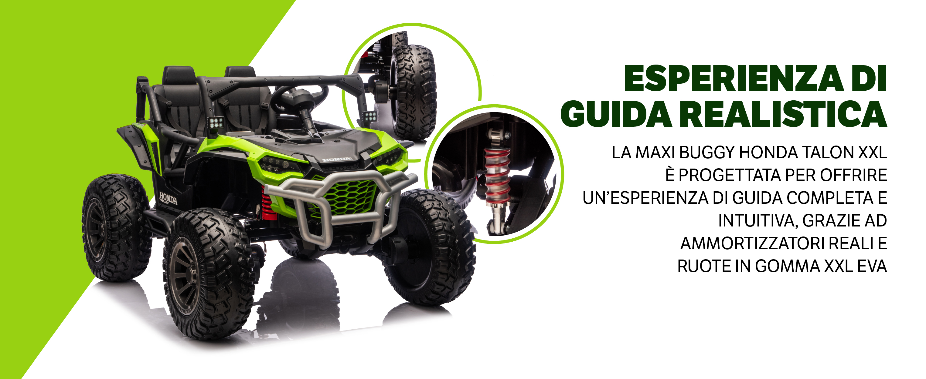 • 🏁 Ruote XXL in Gomma EVA e ammortizzatori reali per ogni terreno (portata max 60 kg)