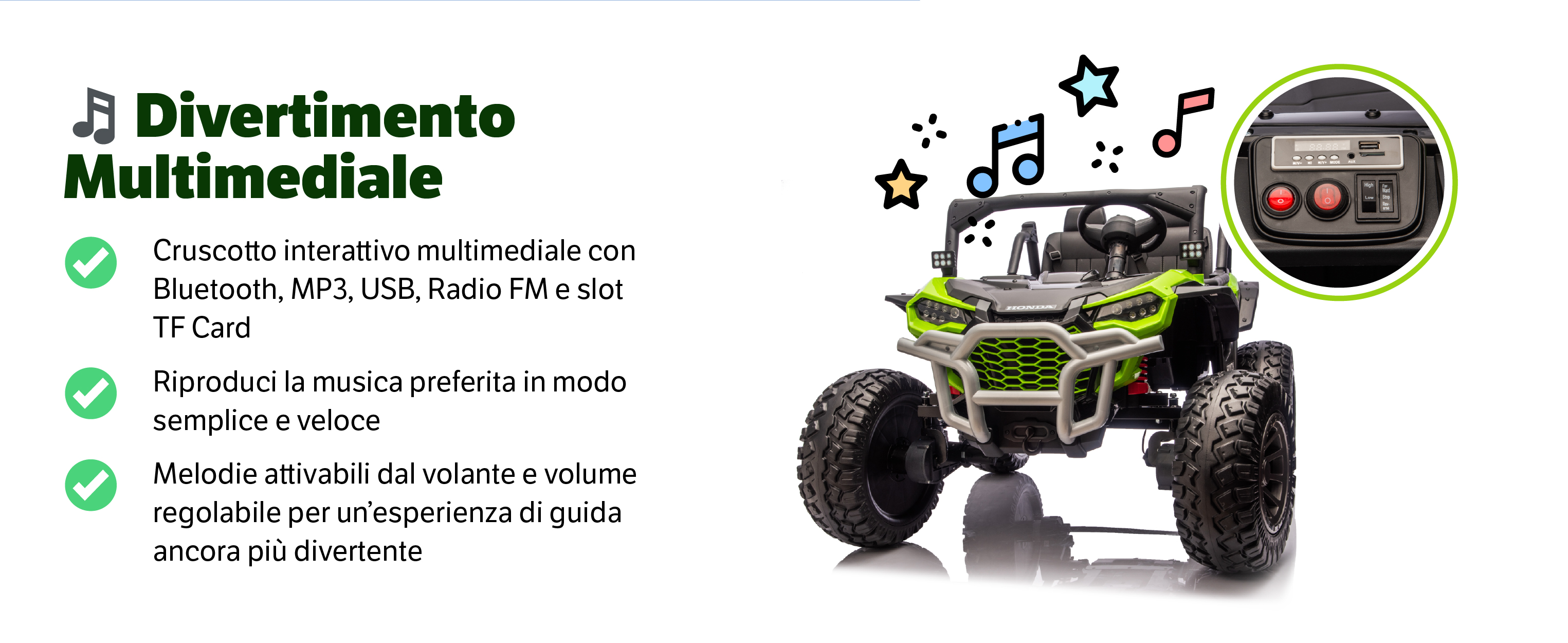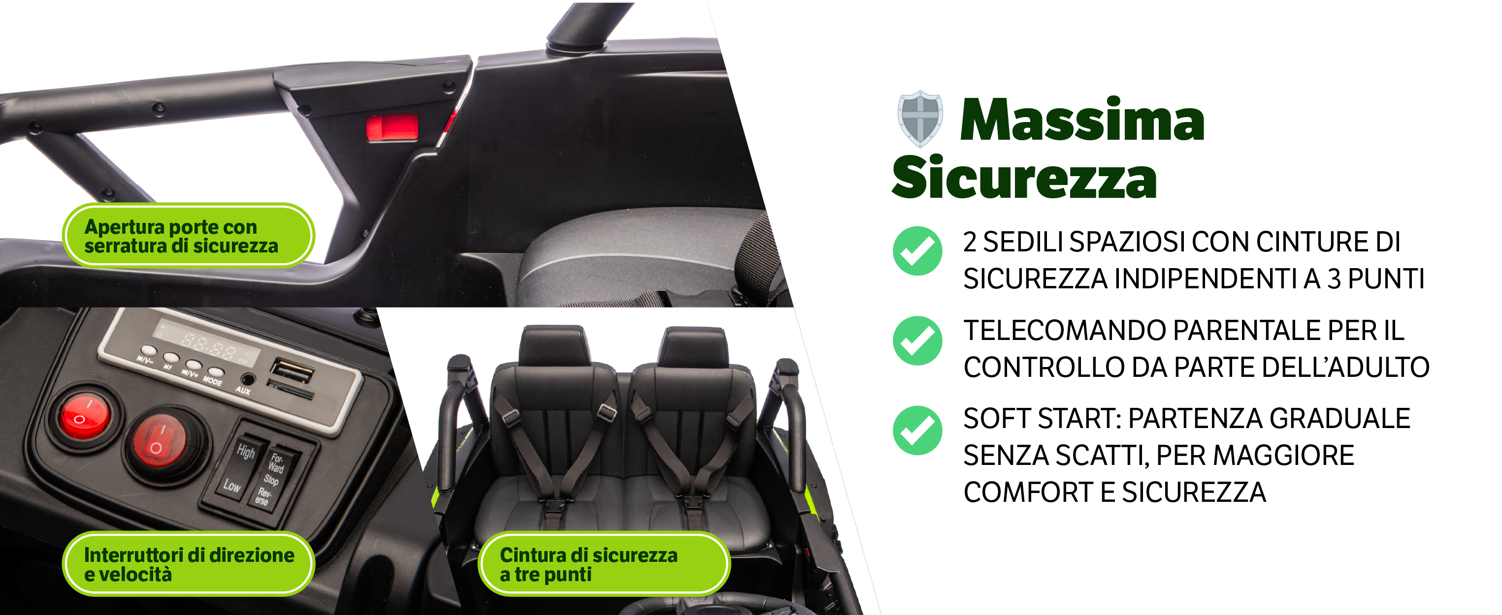 • 🛡 Sicurezza top: 2 sedili con cinture a 3 punti individuali (largo 55cm), soft start, telecomando parentale 2.4GHz con freno d’emergenza e 3 velocità