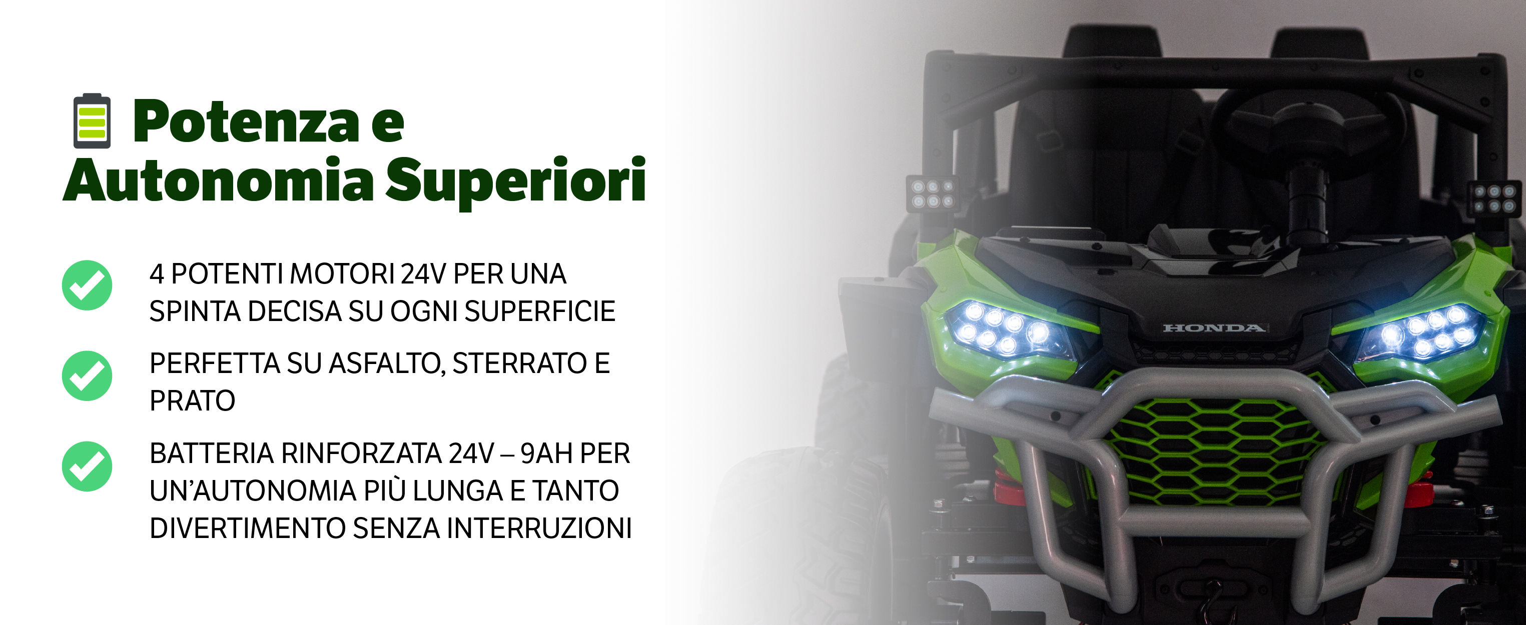 • 🔋 4 motori 24V + batteria maggiorata 24V-9Ah maggiorata per potenza e autonomia prolungata